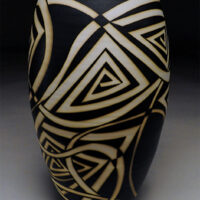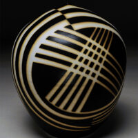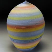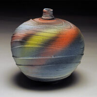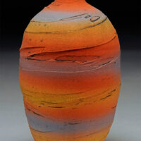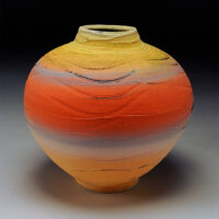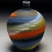 Early experiences with clay as a child apparently left a mark. After school, apprenticeships and more school, making pots was, is and will continue to be a way of life. I’ve been a studio potter for nearly 40 years now, living and working in Arizona for much of that time. My work as a professional has always been low fire earthenware. For many years my Raku pots were shown nationally. The influences are scattered from the Southwest, Africa and Japan to the cultures of the Mediterranean. A museum full of 2000 year old pots in Rhodes was an epiphany. Simple forms with no contrivance or pretension filled room after room. I hope to make one like that before I’m done. Seeing those pots 25 years ago started this current evolution. It began with soft muted colors and classic shapes. Amphora, ewers, and jugs with an ancient feel. Then, textured pots with extravagant handles, spouts and flourishes using brushed color. Over the last 25 years the current body of work has evolved. Hot colors, simple closed forms with very controlled textures dominate. High fire porcelain and white stoneware have now been added to the mix. This work is completely different from the earthenware. Different clays, firing and extravagant decorating techniques give homage to my influences and work from the from the past with a whole new level of skills and maturity. The last piece finished today, good, bad or indifferent is the product of doing the work for many years. These pieces can’t be made without those experiences, successes and failures, lots of failures. Even after 40 years, everyday in the studio is an adventure; I’m looking forward to working tomorrow.
