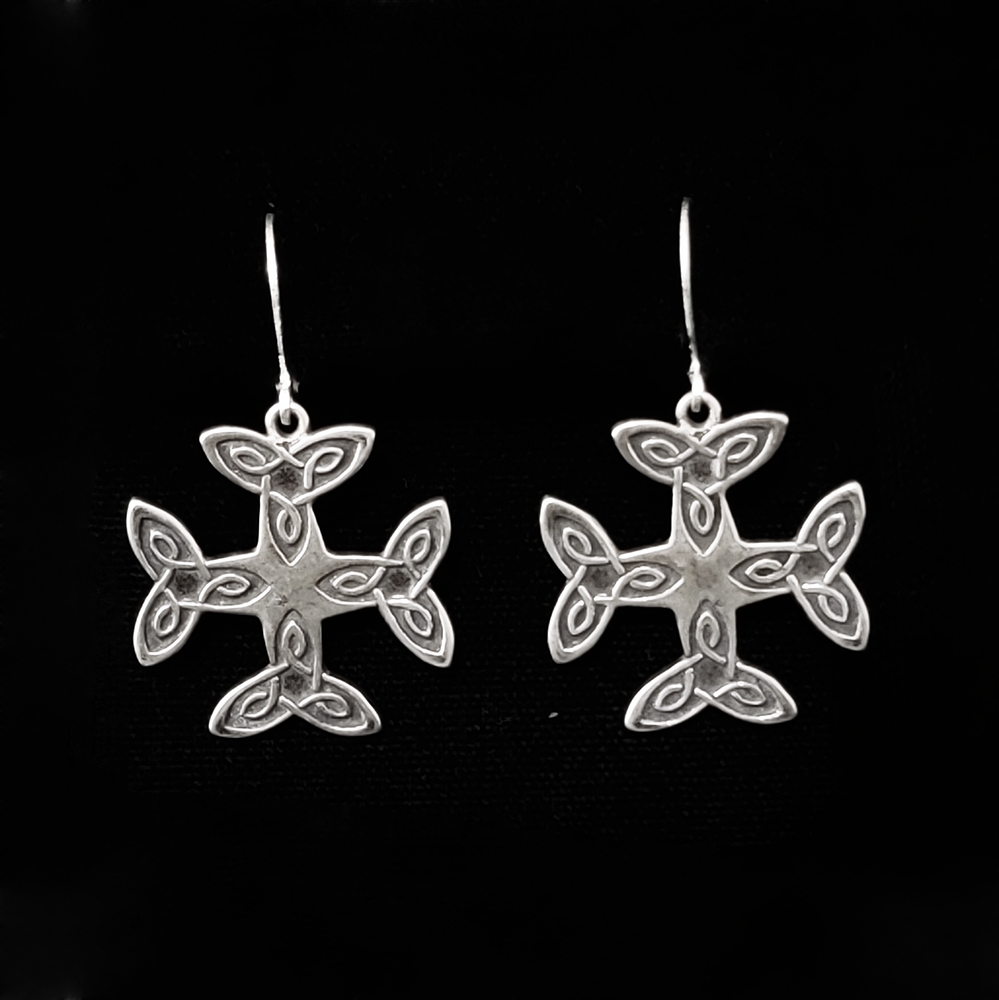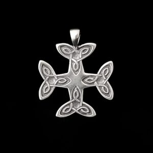 This cross was insprired by the design in a stained glass window in the Cologne Catherdral dedicated to the Blessed Virgin Mary. The design depicts the mystery of the Trinity. The word trinity come from Latin trinitus which means three are one. The first stone of the great cathedral of Cologne was laid in 1248. When it was finished in 1880, it was the tallest building in the world. It was constructed on the site of an earlier church bulit in 818. That old church stood on the ruins of a 4th century BC Roman temple which has been built where Celtic settlers smelted iron and traded salt with the Greeks in the 7th century BC.