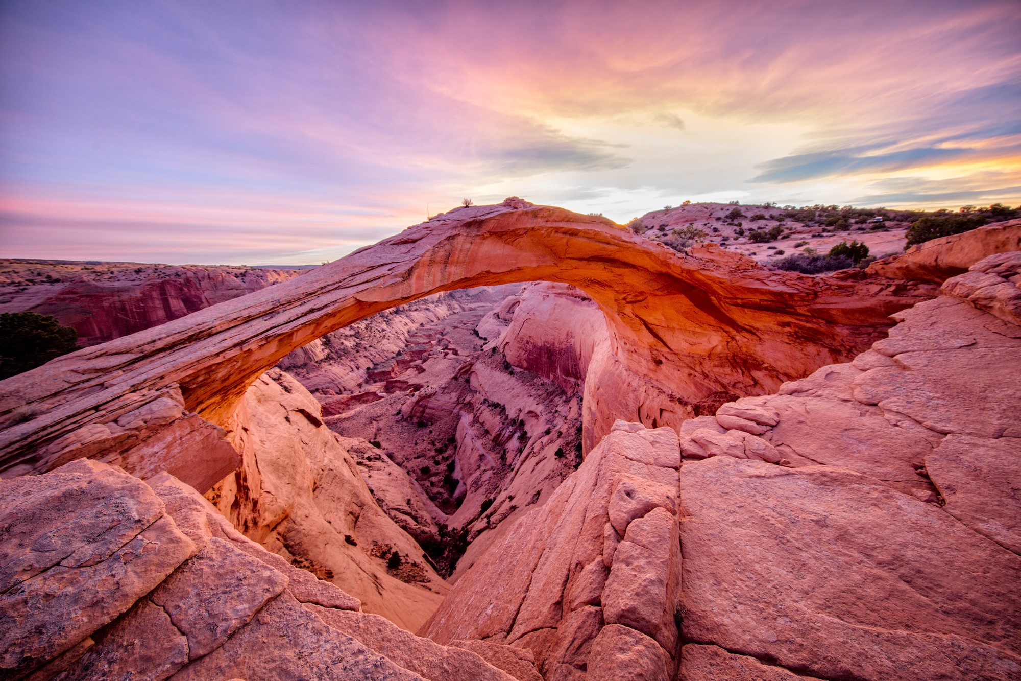 Eggshell Arch is one of the most beautiful arches in Arizona. It is sometimes called Thanksgiving Arch because the late fall is the time of year when it glows bright red as the sun sets. The arch is on Navajo land and is only accessible with the permission of a local leaseholder. It requires a difficult 4-wheel drive over slickrock and by the time we get our best shots we need to drive out in the dark. This image was taken after sunset when the residual, indirect sunlight takes on a predominantly blue hue.