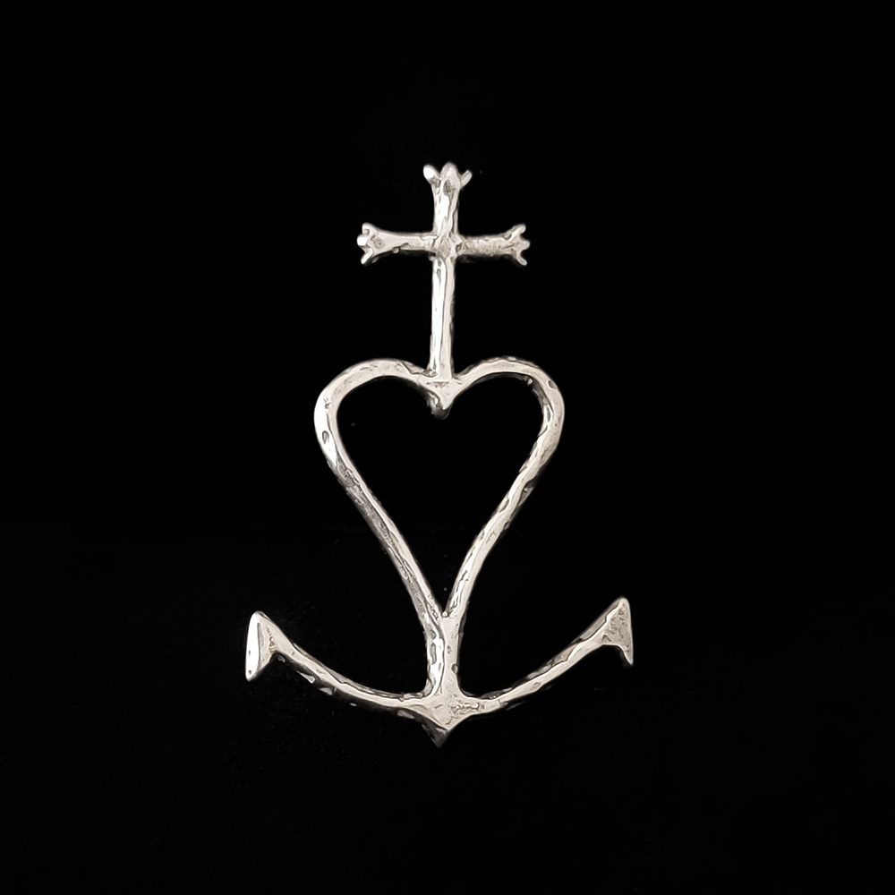 The Camargue cross, designed by painter Paul Hermann, is generally forged in iron and graces the doorways of most homes and public buildings. The cross symbolizes faith, the anchor hope, the heart charity, and the three pronged termination of the cross, the guardians. A similar design cross designates the arc at the bottom as the crescent moon, a symbol of Mary.