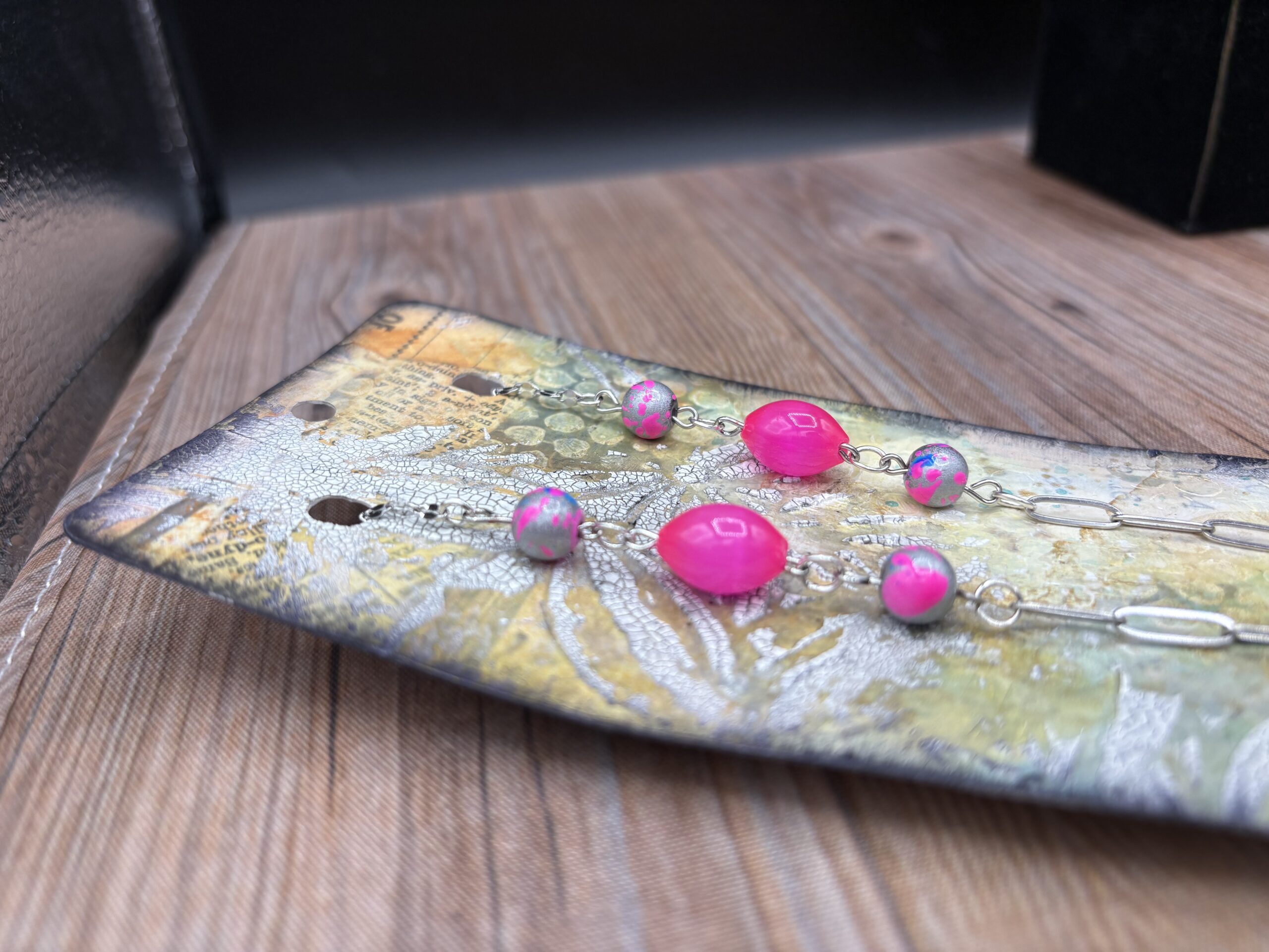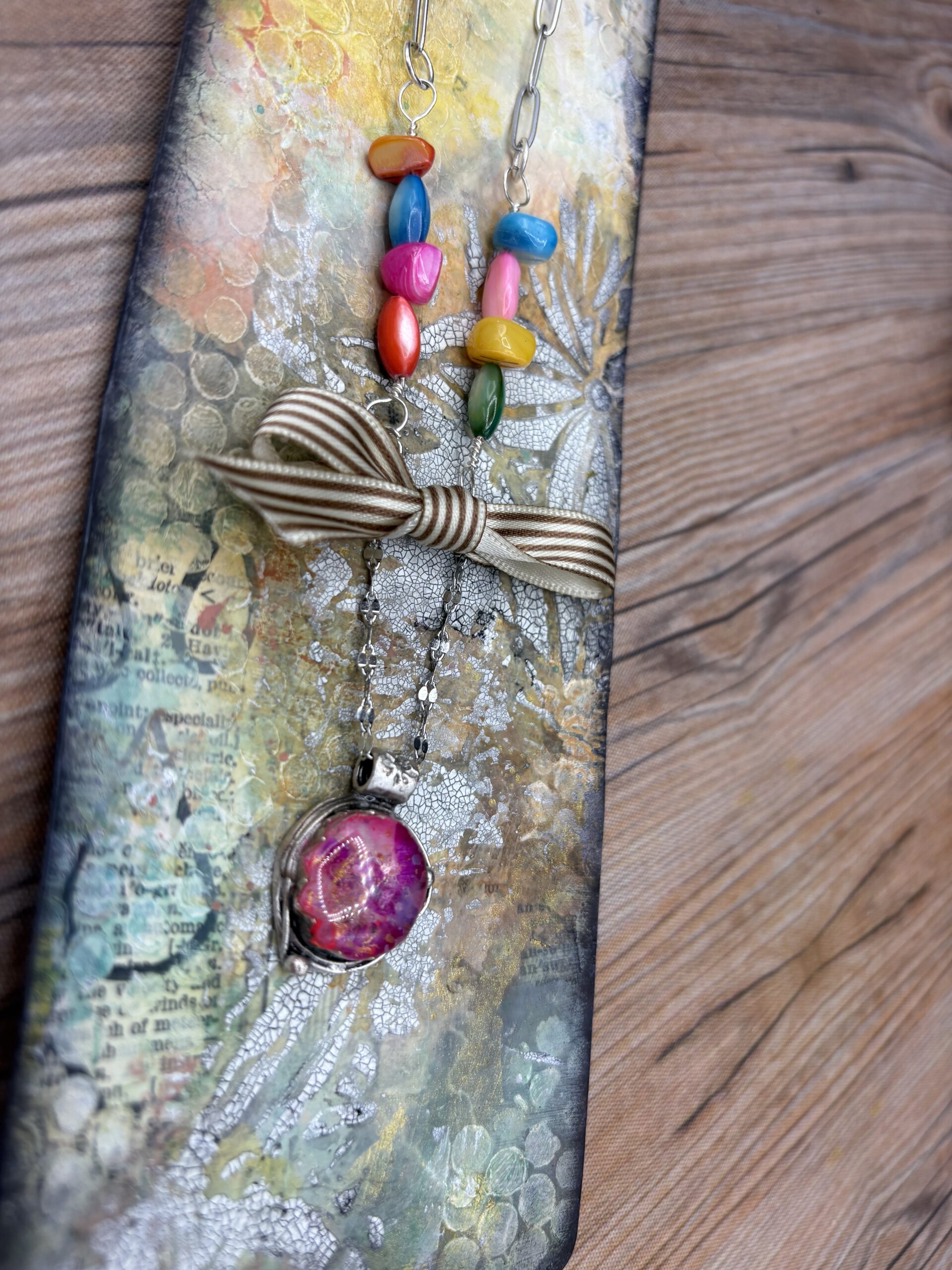Candy Current Necklace made with a Chain, Beads, Paper, and Resin Bezel by Sharon Gilham with unique Artist item number scs118n