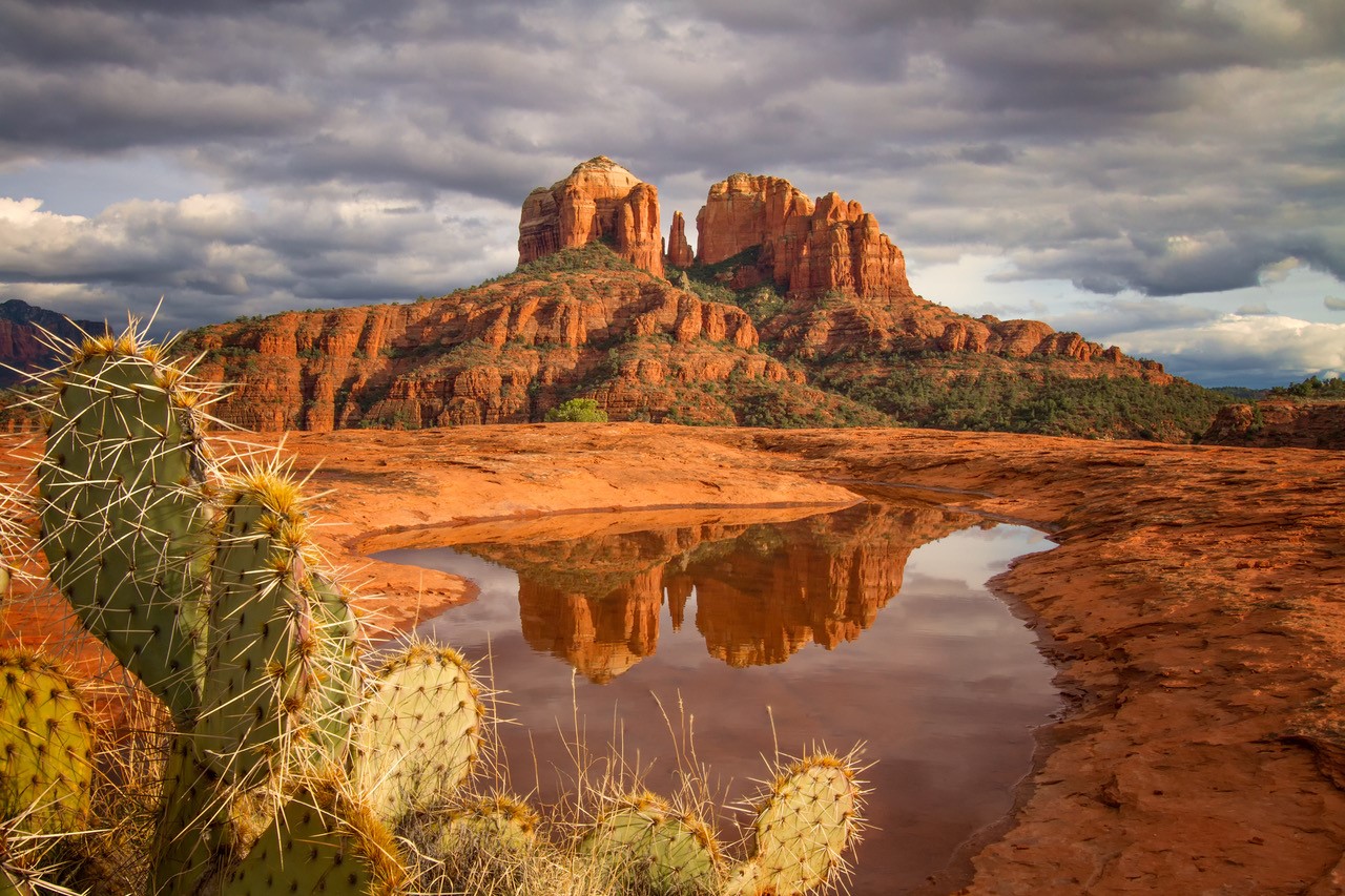 Cathedral Rock is an iconic landmark on the Sedona, Arizona skyline, and is one of the most-photographed sights in Arizona. Geologically, it is carved from the Permian Schnebly Hill formation, a redbed sandstone formed from coastal sand dunes near the shoreline of the ancient Pedregosa Sea. Cathedral Rock can be photographed from various vantage points in Sedona. This image was taken near sunset at a location I frequent after a rainstorm when the shallow pools fill with water and provide the beautiful reflection.