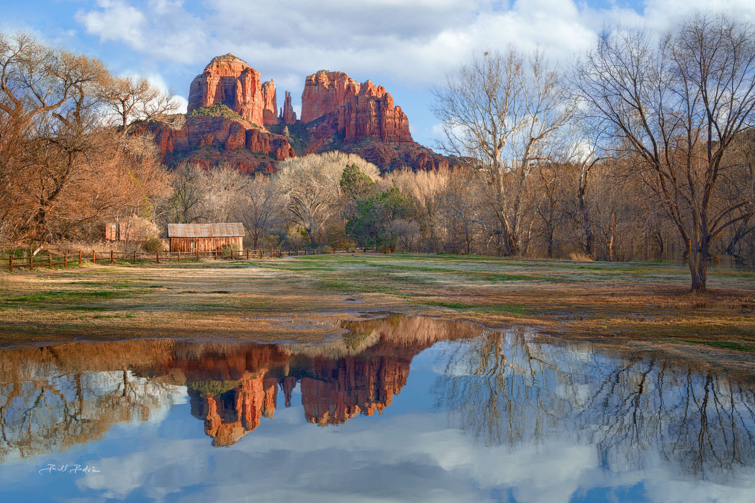 This photo was shot in February, 2019 at Crescent Moon Ranch following a one inch rainfall. Shown in the image are Cathedral Rock, reportedly the second most photographed location in Arizona after the Grand Canyon, and two ranch buildings on the left. The left most building was constructed in 1937 and is next to a water wheel. The water wheel was used to generate electricty for the ranch. The water for the wheel was diverted from Oak Creek and no longer flows. The water was also used to irrigate the ranches orchards and fields.