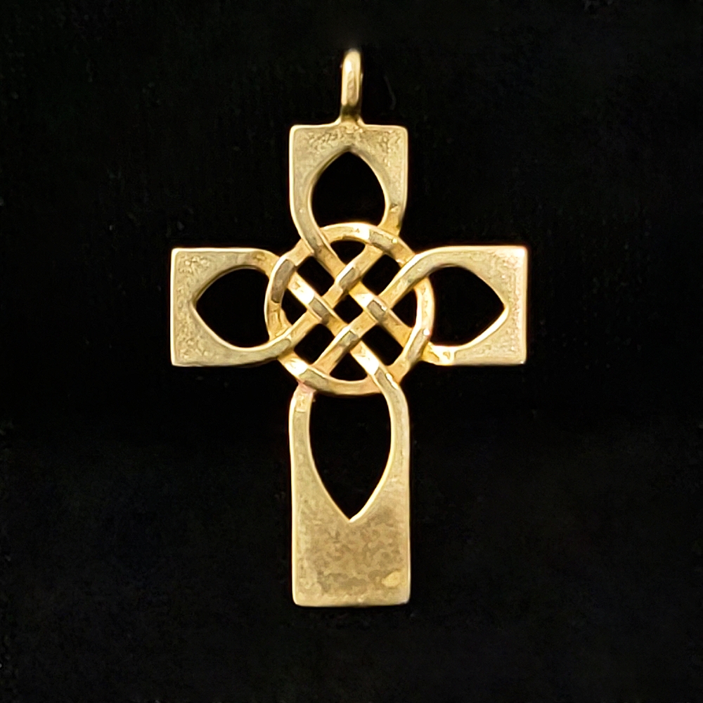 This is a contemporary Scottish cross based on the lives of the Four Apostles, Matthew, Mark, Luke and John. The four arms weave around a Celtic knot work center which represents Christ, their leader.