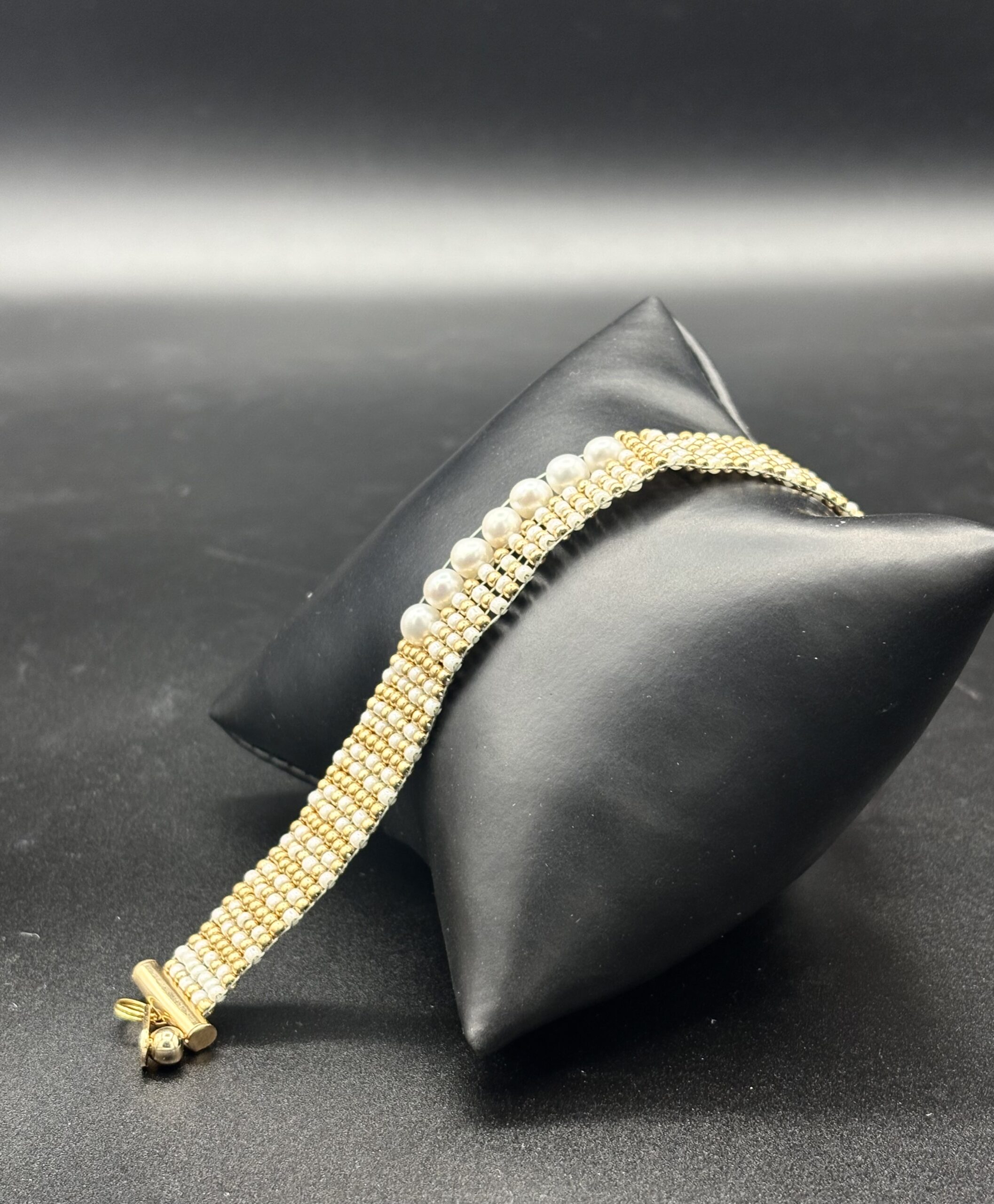 ‘Gold and Ivory Miyuki with White Fresh Water Pearls’ bracelet by Nancy Leicht