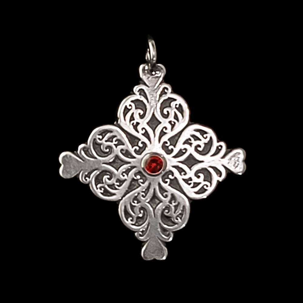 This cross is inspired by Shakespeare’s tragic lovers, Romeo and Juliet. The design is an intricate pattern akin to designs of that era and features a ruby CZ or Garnet in the center.