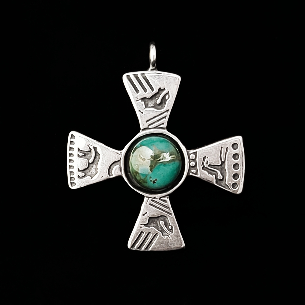 Among all the tribes which inhabit the praries of America, the Lakota Sioux are probably the most well known today. This cross is a combination of symbols that often decorated the flaps of their tipis-horses, bears, buffalo, etc. It is a contemporary design by Deanne McKeown and the cross is enhanced by setting a Kingman turquoise cabochon in the center.
