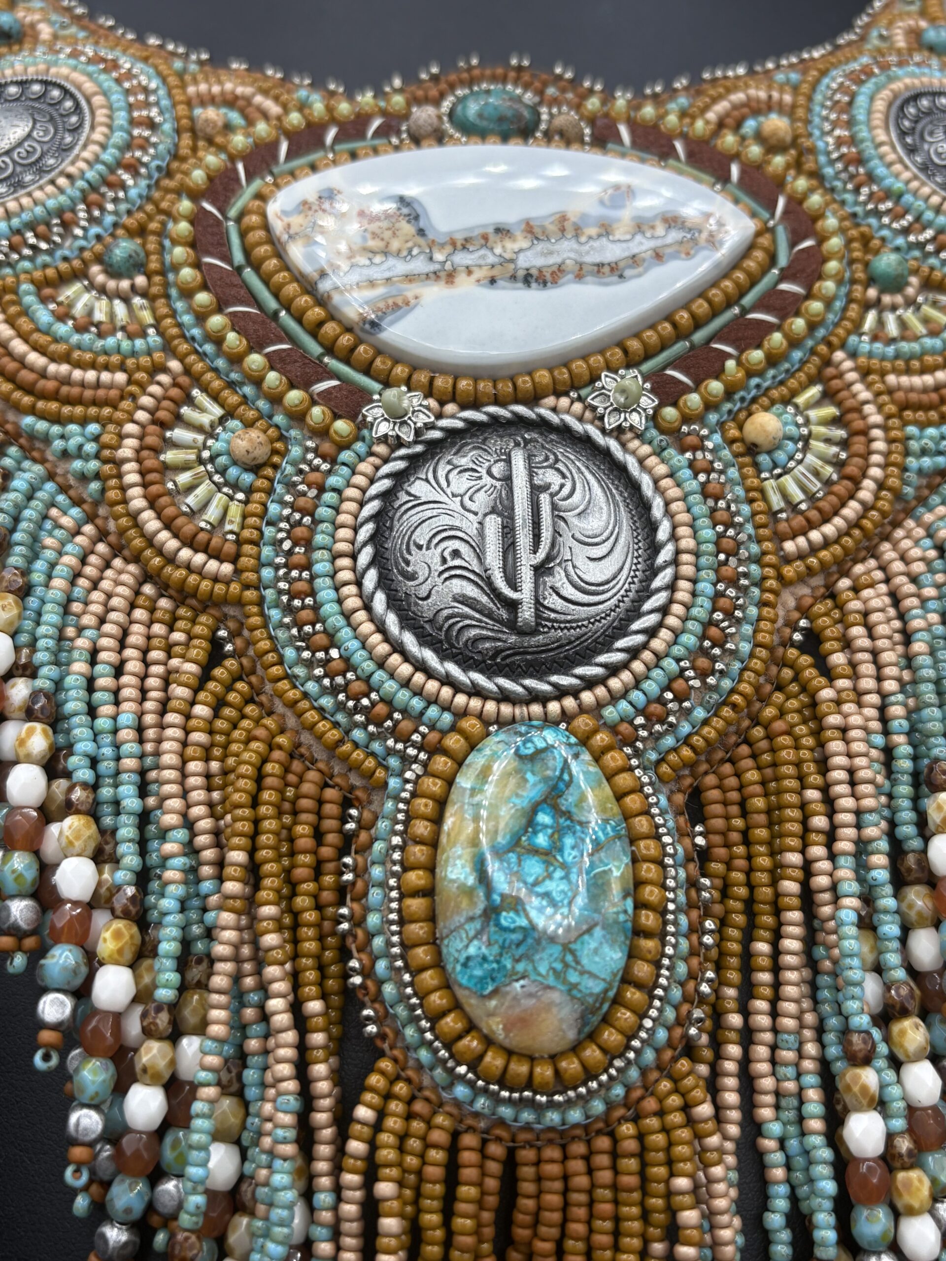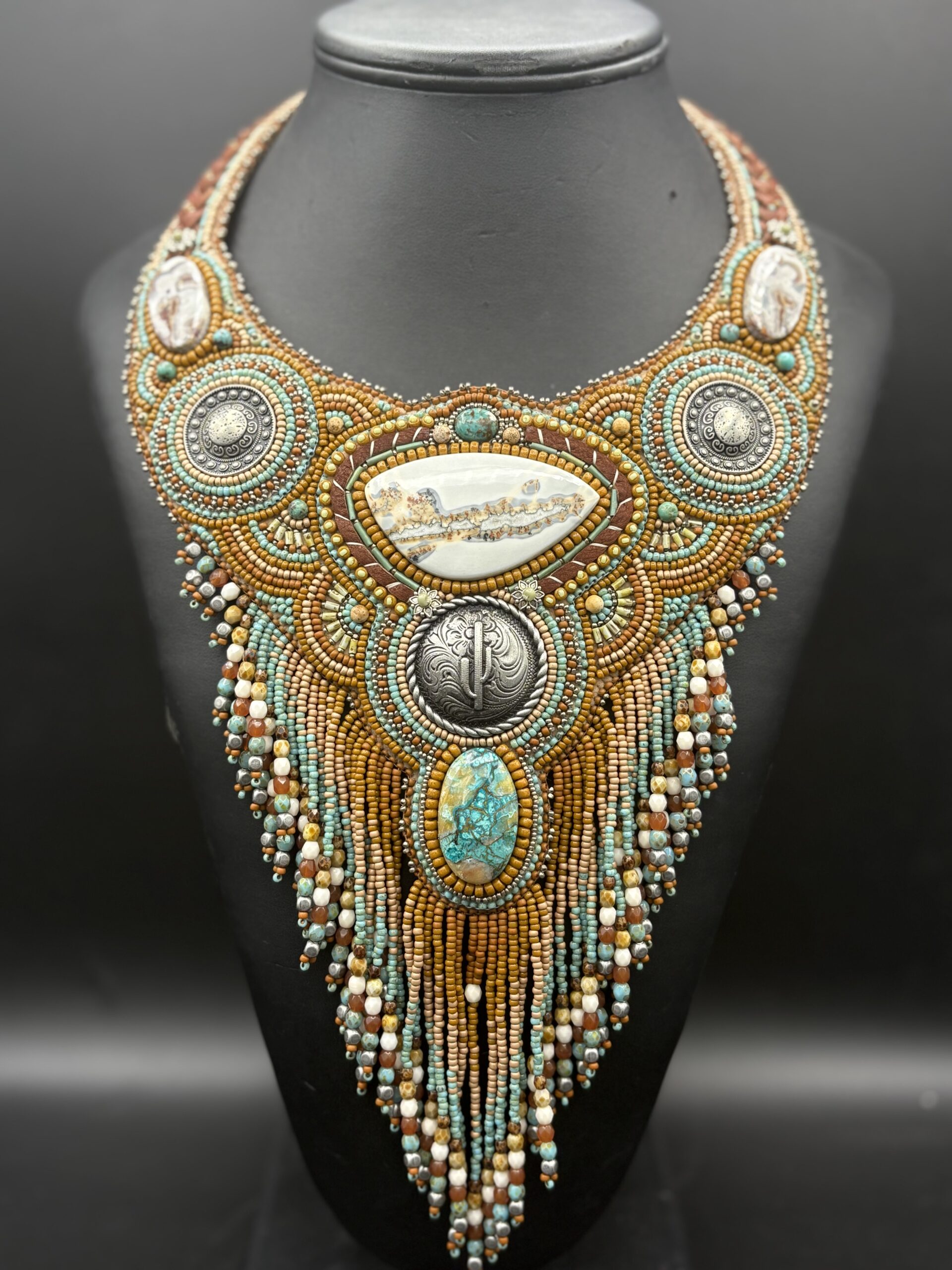 ‘My Desert Home’ Maligano Jasper, Chrysocolla and Crazylace Agate, beaded neckpiece by Sue Horine