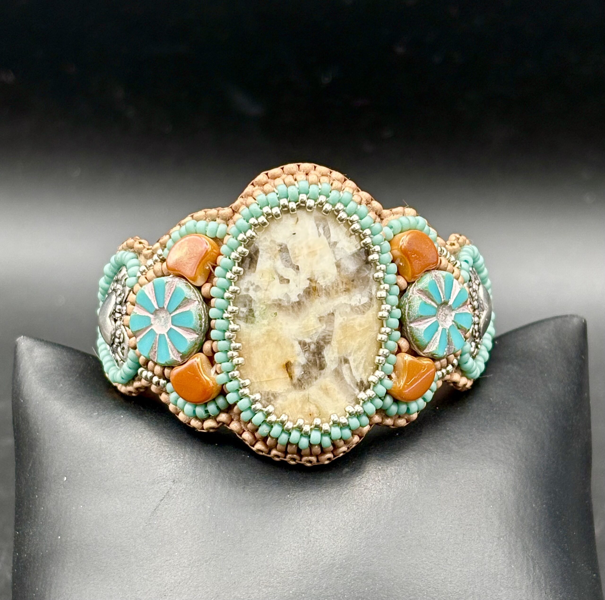 Sue Horine has been creating bead embroidered art jewelry since 2005. She was born in California and much of her inspiration comes from her childhood family vacations to the Southwest and Sierra Nevada Mountains. Primarily self-taught, her beaded jewelry has become easily recognizable as her style has developed from her love of nature and the scenic stone cabochons she incorporates in her work.