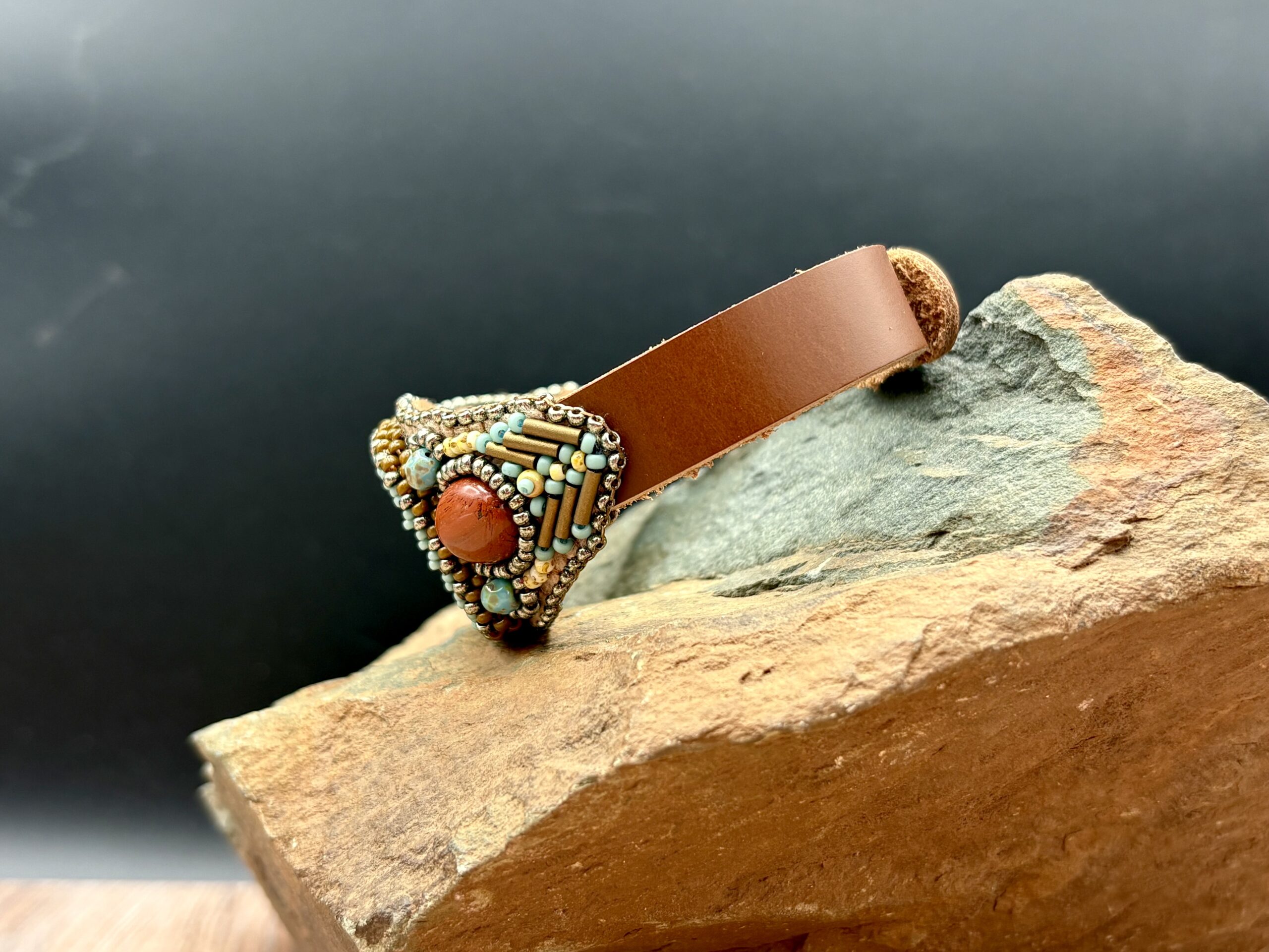 Sue Horine has been creating bead embroidered art jewelry since 2005. She was born in California and much of her inspiration comes from her childhood family vacations to the Southwest and Sierra Nevada Mountains. Primarily self-taught, her beaded jewelry has become easily recognizable as her style has developed from her love of nature and the scenic stone cabochons she incorporates in her work.