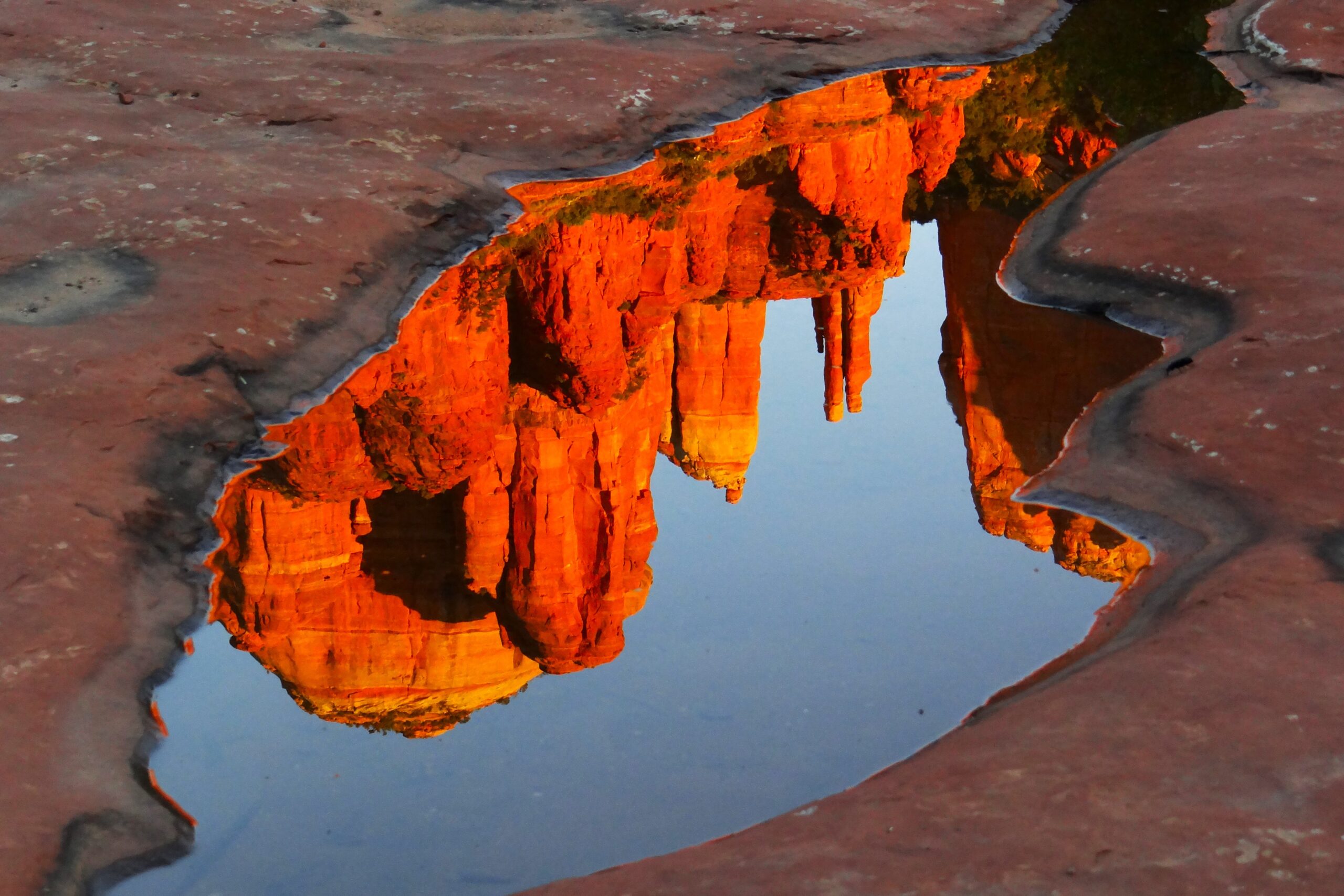 Cathedral Rock is one of the most-photographed sights in Sedona, Arizona. The photo was taken from a different perspective—the reflection of Cathedral Rock in a puddle.