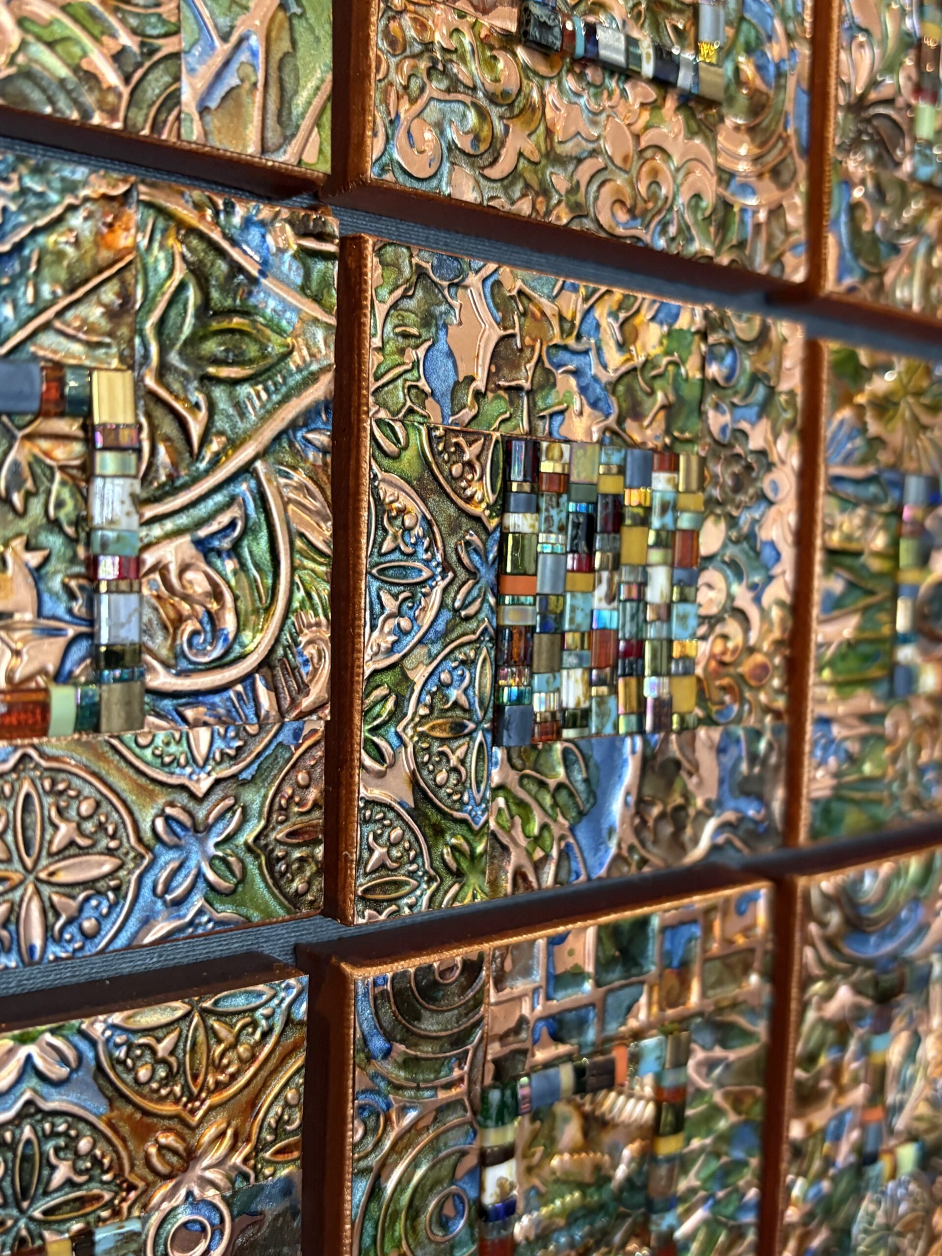 My metal embossed pieces begin with heavy metal foils in copper, brass and aluminum. They are embossed using multiple plastic embossing folders that are run through a rolling mill. I use alcohol inks to color and then begin the process of cutting and assembling my mosaics. They are somewhat like a jigsaw puzzle that I get to design and assemble! I sometimes use glass tile beads to add a little more dimension.