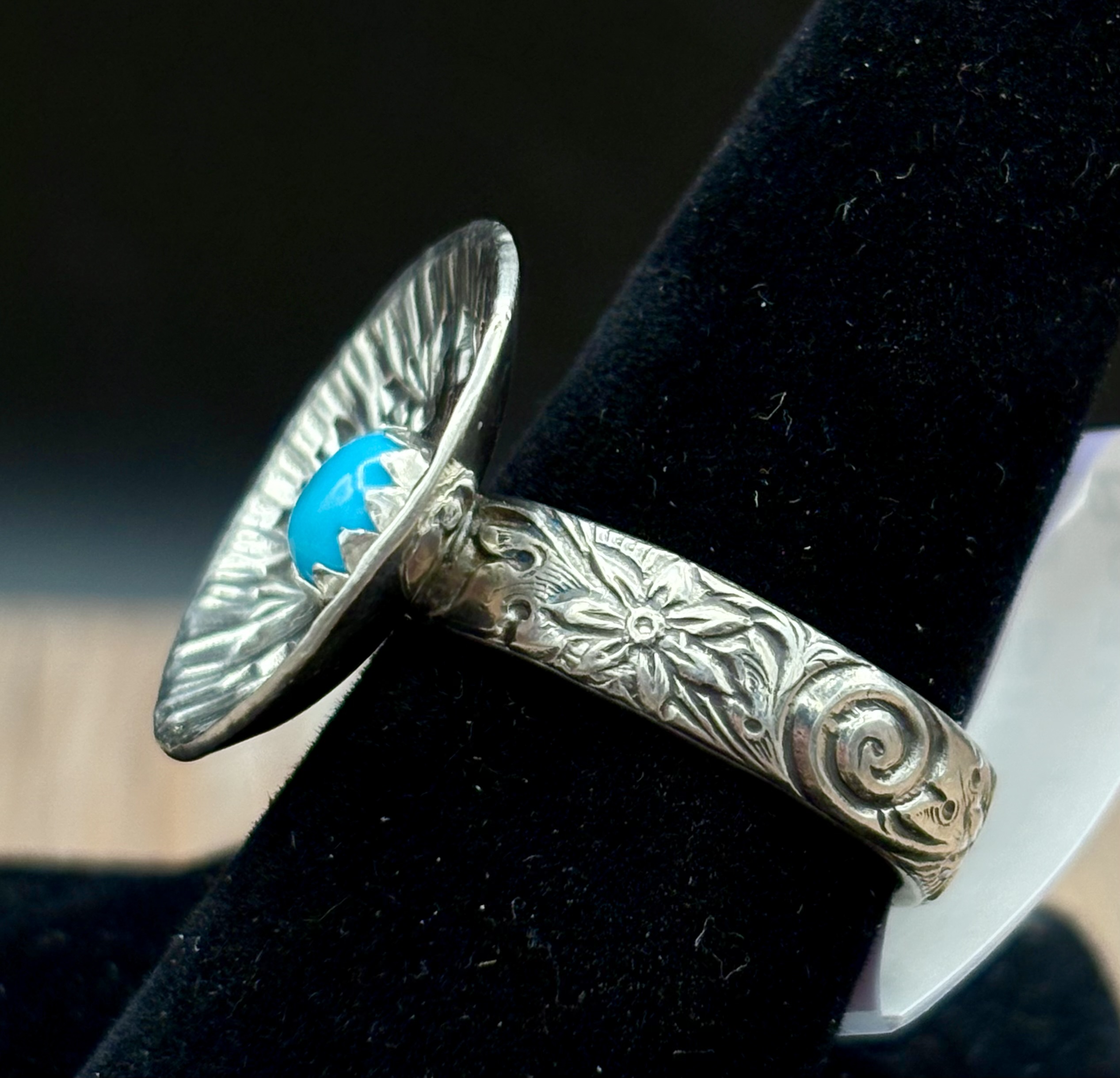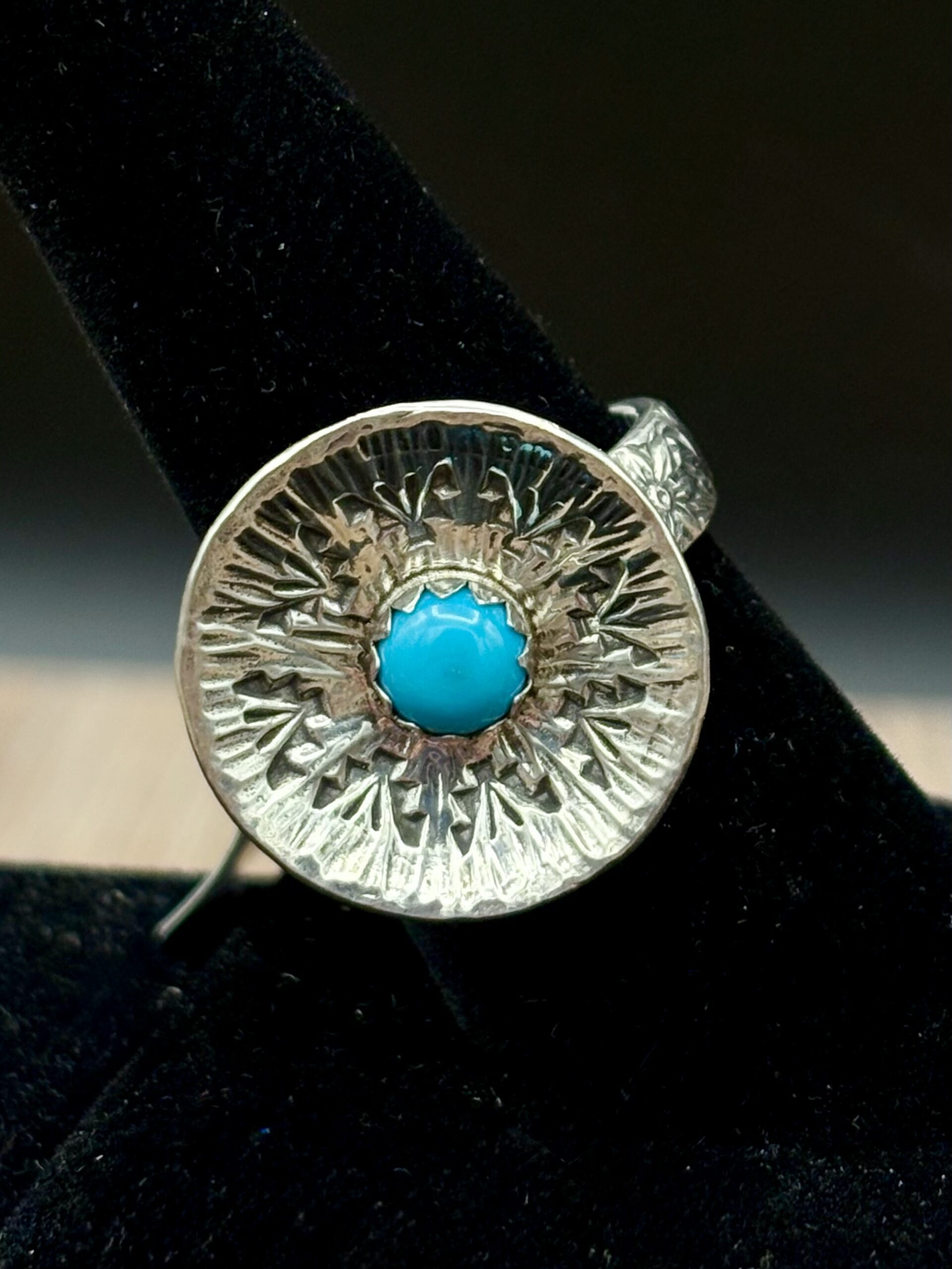 Sterling Silver Dine Basket Design with 6mm Sleeping Beauty Turquoise Ring by Tom Yazzie TYR-752 Size 9