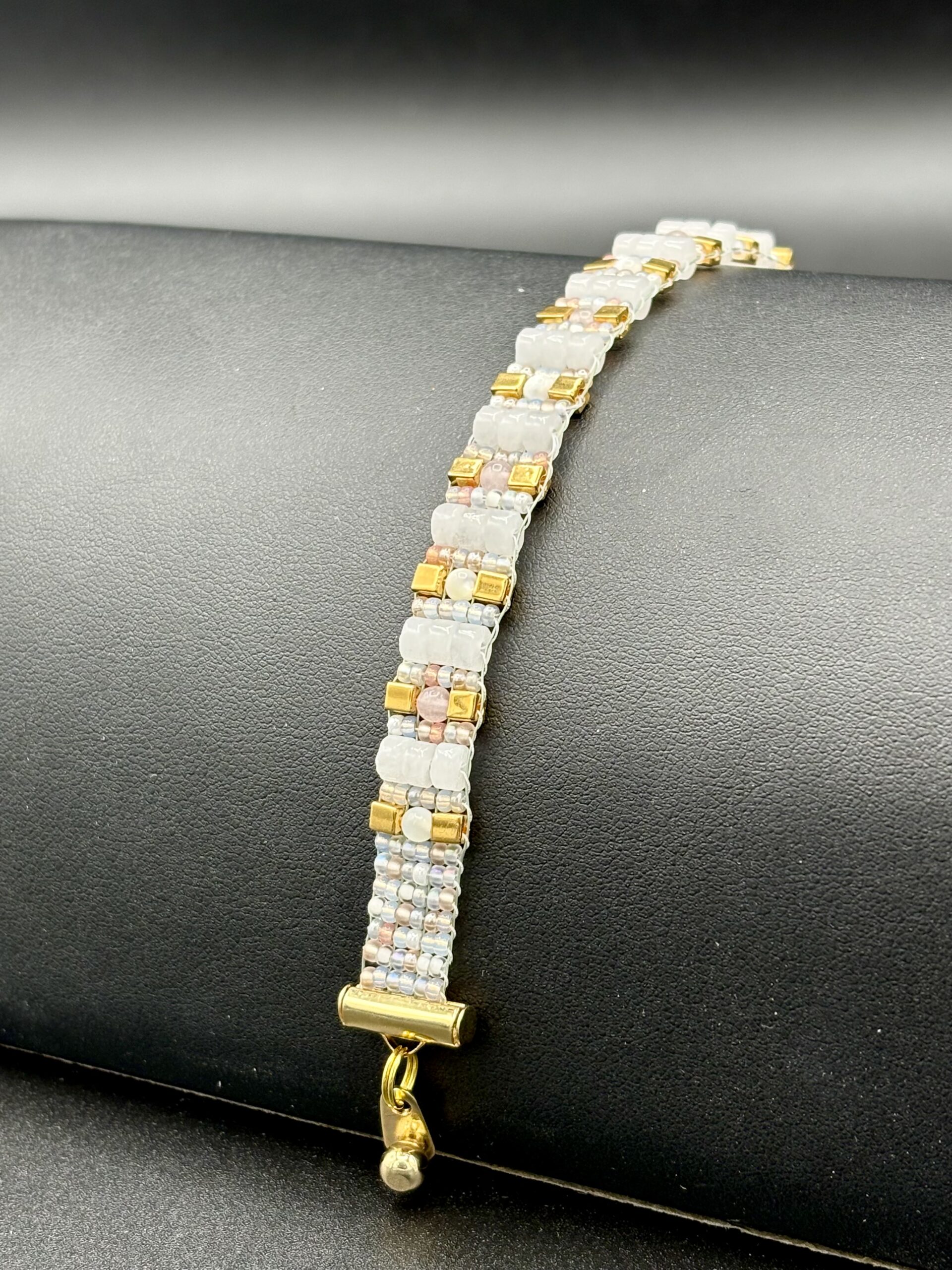 ‘White Jade Heishi, Rose Quartz and Mother of Pearl’ with mixed pastel seed beads, bracelet by Nancy Leicht