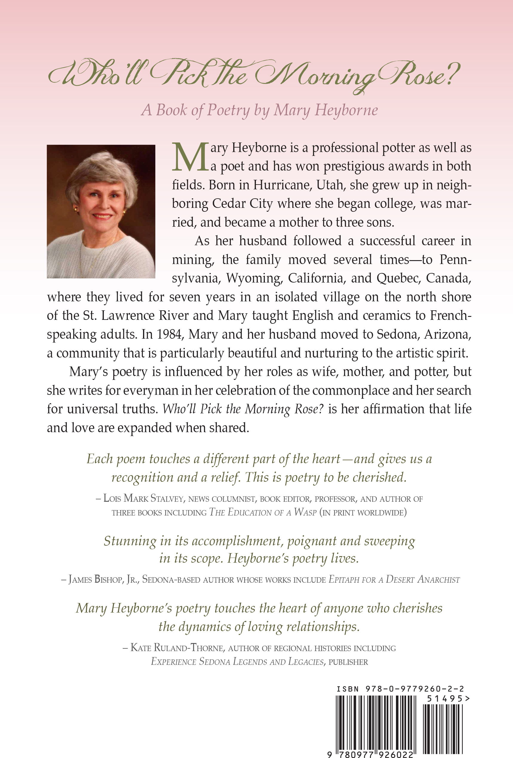 Mary’s poetry is influenced by her roles as wife, mother and potter, but she writes for everyman in her celebration of the commonplace and her search for universal truths. “Who’ll Pick the Morning Rose?” is her affirmation that life and love are expanded when shared.